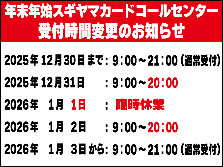 年末年始のスギヤマコールセンター受付時間変更のお知らせ