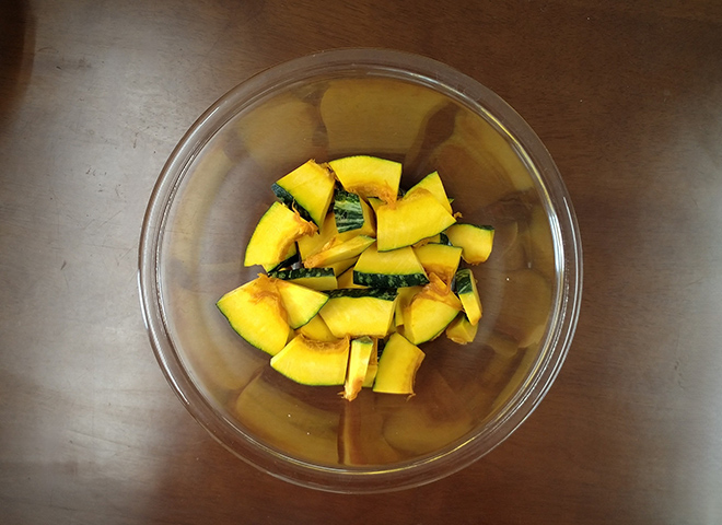 耐熱ボウルに1のかぼちゃと軽く水を振り入れて、ふんわりとラップをする。